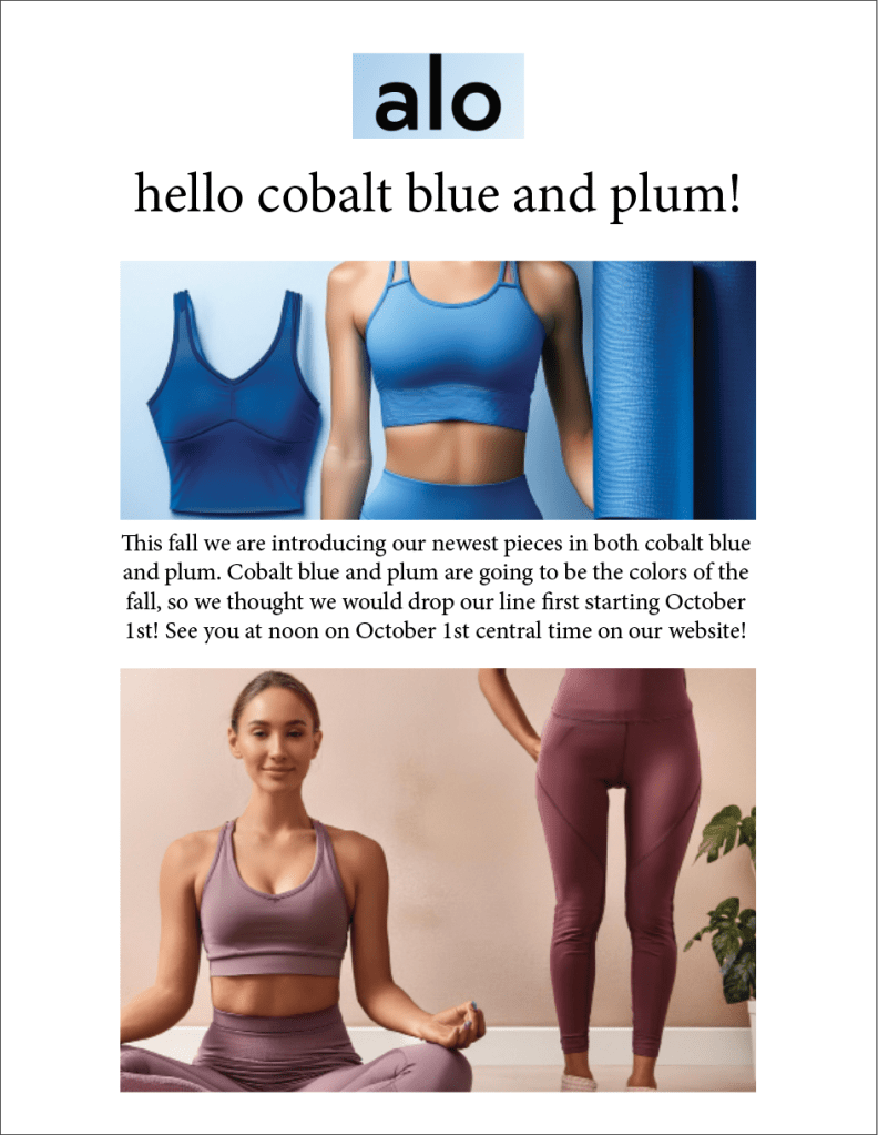 Encouraged by the success of my first design, I wanted to take it a step further by creating a second version with cobalt blue yoga clothing. I thought it would be a smart move for an athletic brand like Alo to release new products in multiple colors, and I wanted to replicate that approach in my design.