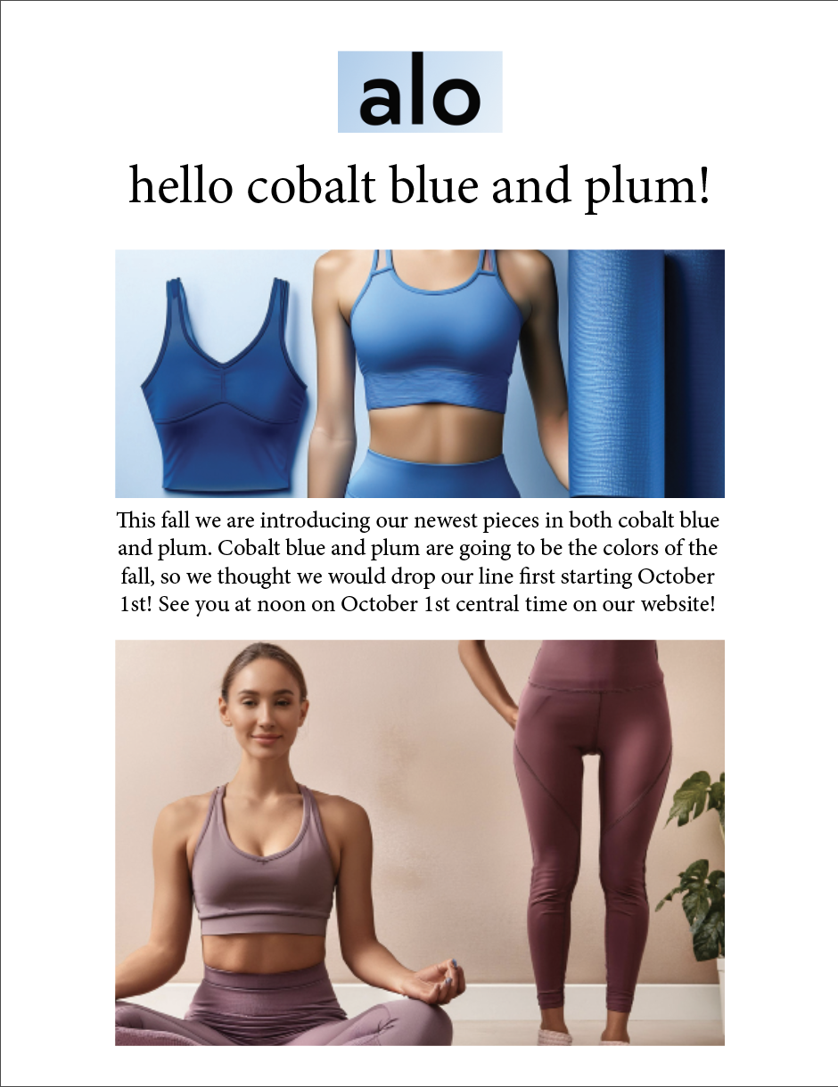 This design was created for my Style and Design for Public Relations class, where we were tasked with using generative AI in Photoshop to develop content for an organization. I chose to create a graphic for an upcoming Alo drop. This semester, I focused on creating projects for Alo as if I were an employee. This project taught me how to use AI in Adobe and how to edit and create in Photoshop.